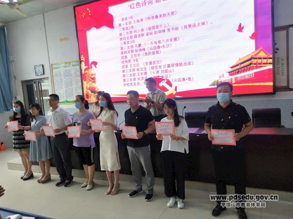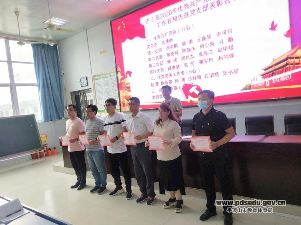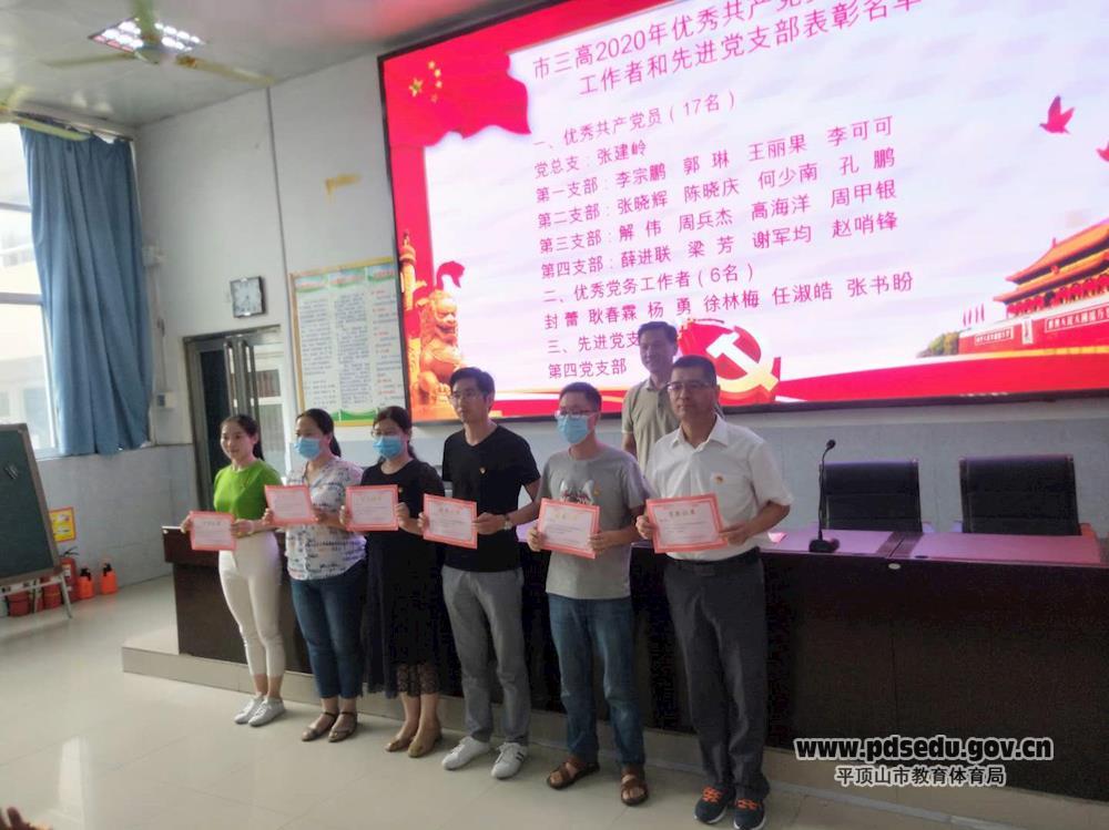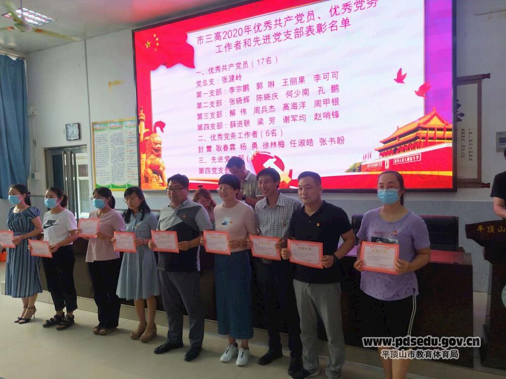 解伟宣读了《市三高关于表彰2020年度优秀党员、党务工作者及先进党支部的决定》和《市三高“红色诗词朗诵”比赛表彰决定》。校领导现场为全体获奖者颁奖。