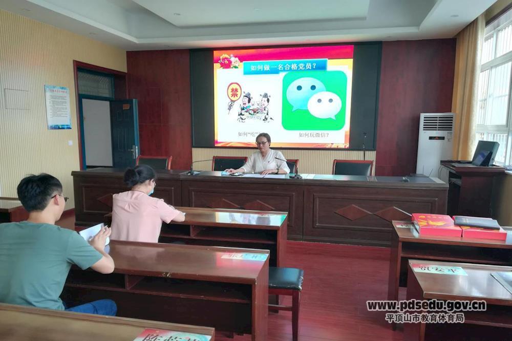6月29日,市四十中党支部召开“不忘初心继续前进,争做合格共产党员”主题活动。会上,景艳伟宣读了《中共平顶山市教育体育局直属机关委员会转发平组通【2020】24号关于在“七一”期间组织开展以“牢记初心使命、争当出彩先锋”为主题的支部党日活动的通知》。接着,景艳伟从“如何做一名合格党员”和“为人民服务”两个方面,结合自己的工作经历,为全体党员教师做了《不忘初心继续前进,争做合格共产党员》主题党课。活动中,四十中党员教师结合自身经历纷纷发表自己的观点,坚定理想信仰,牢固树立乐于奉献,勇于担当的共产党员品格。