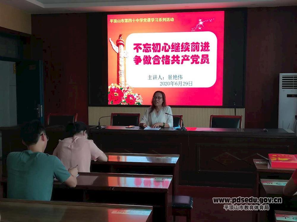 为庆祝中国共产党成立99周年,继续巩固拓展“不忘初心、牢记使命”主题教育成果,引导全校党员深入学习领会党的创新理论,近日,市四十中开展了迎“七一”庆祝建党99周年系列党建活动。