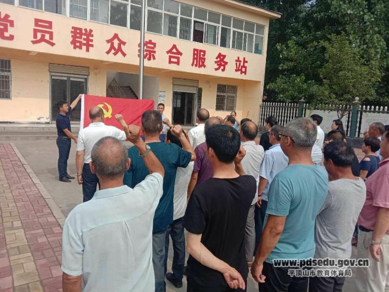 在柏庄村党员群众服务站,市教育体育局直属机关专职副书记陈成功、人事科科长王蕾以及在场的30多名党员干部进行了升旗仪式,重温了入党誓词。陈成功书记又为全体党员干部讲授了一节精彩的专题党课。