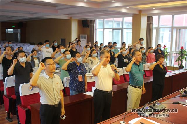 会议伊始,全体党员佩戴党员徽章,高唱国歌。面对党旗党徽,在市八中副校长徐劲松带领下重温入党誓词,全体党员教师慷慨激昂,再次庄严宣誓,铿锵有力的入党誓言,使在场的每一位党员都重新接受了心灵洗礼,再次唤醒了大家的入党初心,坚定了理想信念,明确了责任、使命、担当,表达了大家不忘初心、牢记使命,始终保持奋斗精神和革命精神,砥砺前行的坚定决心。