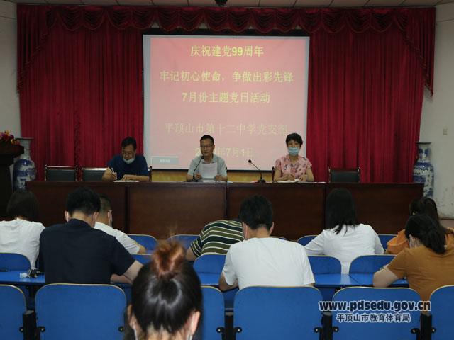 在7月1日,为庆祝中国共产党成立99周年,市十二中党支部组织召开7月份“牢记初心使命,争做出彩先锋”主题党日活动。副校长席明焕讲党课《忆党史,争做出彩先锋》,席明焕带领大家学习中国共产党从建党、从中共“一大”到“十九大”的光辉历程,全体党员从党的历史中汲取丰富的营养、智慧,学习共产党人在艰苦的逆境迎难而上取得一个又一个胜利的精神。