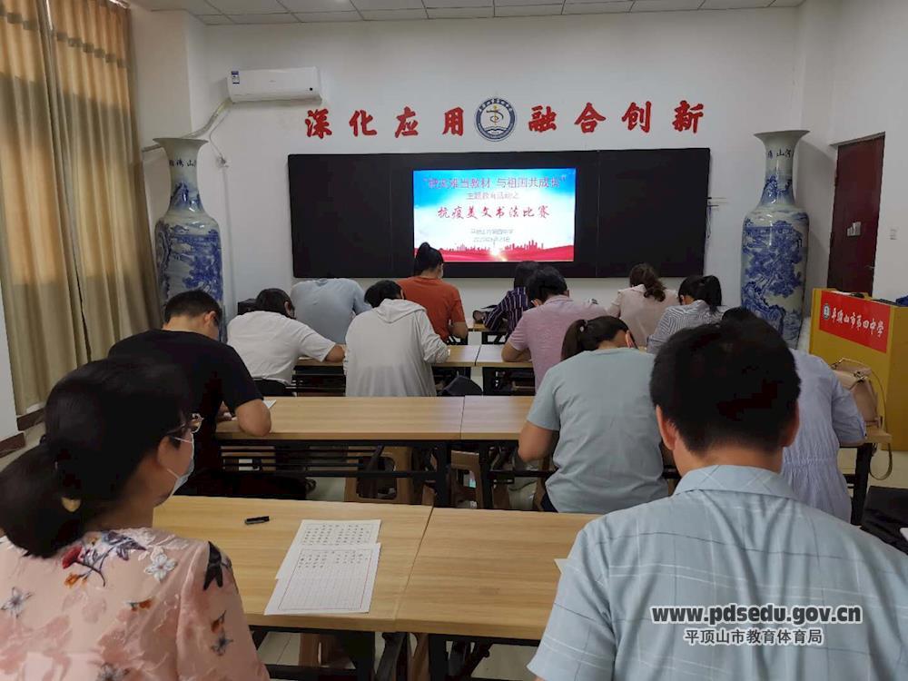 此次比赛共计二十余位选手参加。比赛现场,参赛教师们大展身手,巧妙设计了结合各学科特点的特色板书,书写工整、重点突出,贴近抗疫主题与爱国情怀,体现出课堂教学与爱国教育、生命教育的相融合。