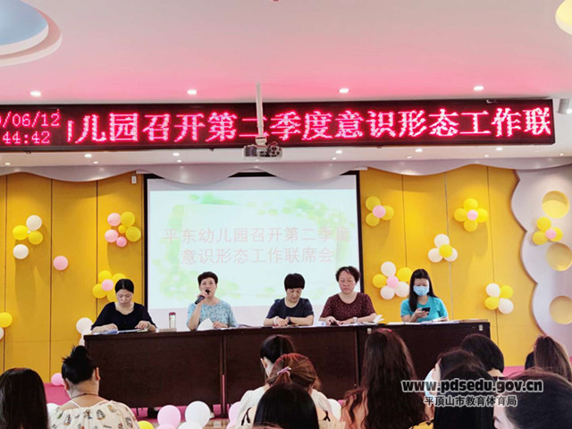 为认真领会市教育体育局关于召开第二季度意识形态工作分析会精神实质,深入学习贯彻习近平新时代中国特色社会主义思想和十九届二中、三中、四中全会精神, 7月13号,平东幼儿园召开第二季度意识形态工作专题会,全体教师参加会议。