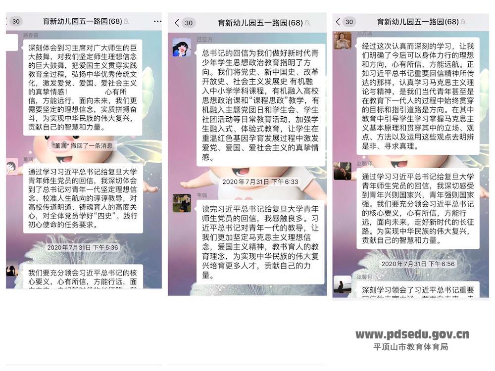 近日,市育新幼儿园积极行动,利用微信公众号等平台下发通知,组织党员和广大教师深入学习习近平总书记重要回信精神。副园长郜智睿在育新幼儿园教师微信工作群做了领学,并与广大党员、教师结合学习情况开展交流研讨。大家一致认为,习近平总书记的回信情真意切、立意高远、思想深邃、内涵丰富。回信肯定了志愿者服务追望大道、传播理论的精神和做法,并向广大党员特别是青年党员提出殷切希望和明确要求。交流学习后,园长、党支部书记裴晓燕强调习近平总书记的回信对广大干部、党员践行初心使命提出了新的要求,幼儿园要把深入学习贯彻回信精神落到实处,并做为当前和今后一个时期的首要政治任务,深入学习领会,加强宣传发动,激发广大干部、党员进一步坚定理想信念,勇担时代责任。