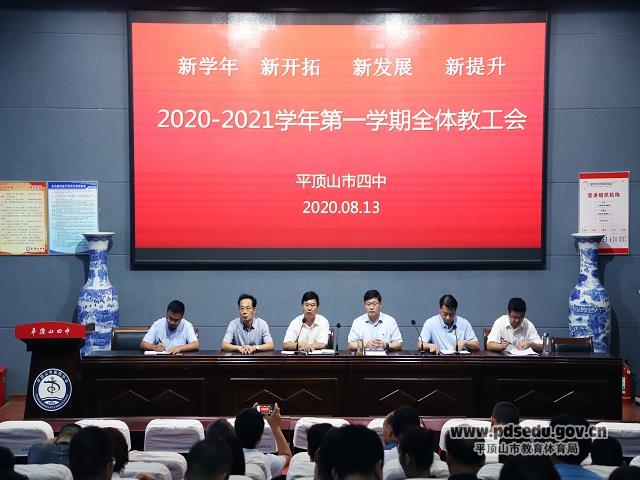 8月13日上午,市四中在校讲座厅召开2020-2021学年第一次全体教工会。会议由副校长王峥主持。