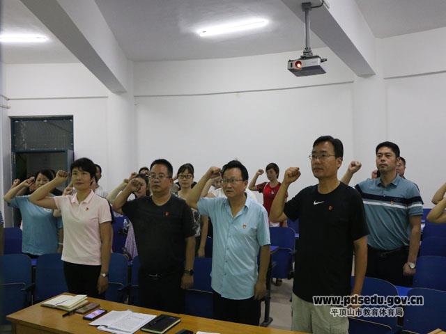 全体党员大会是以八月份主题党日的形式召开的,在副校长、宣传委员席明焕的领誓下,全体党员紧握右拳,面对党旗,庄严宣誓,重温入党誓词。接着,孙新志介绍了本次主题党日的主要任务是集中学习以案促改10起违纪违法典型案例并进行讨论。全体党员学习了《河南省教育系统以案促改警示篇》中的10个典型违纪违法案例,并认真做了笔记。