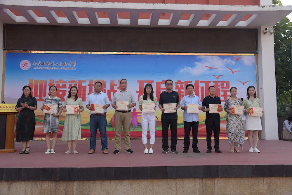 优秀教师代表郝艳丽、高二优秀学生代表徐菁阳、高一新生代表欧阳沫菡的发言激情澎湃。目标在前,使命在肩。新的学年,只要我们携手同心,保持锐意进取、永不懈怠的精神状态和敢闯敢干、一往无前的奋斗姿态,我们定能不断攀登险峰峭壁,跨越恶水深潭,全力开创出卓越二高的新未来!