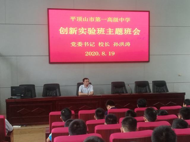 8月19日是市一高2020级高一新生入校学习的第三天,作为创新实验班的班主任,校党委书记、校长孙洪涛亲自在校阶梯教室为学生们上了一节主题鲜明、教育意义深刻的主题班会课。学校副校长郭继方、李德权、郭焕涛,政教处主任马占超,教务处主任左永记、副主任张彦彪,高一年级全体年级长到场观摩学习。主题班会由郭焕涛主持。