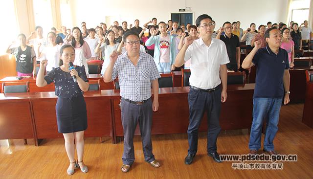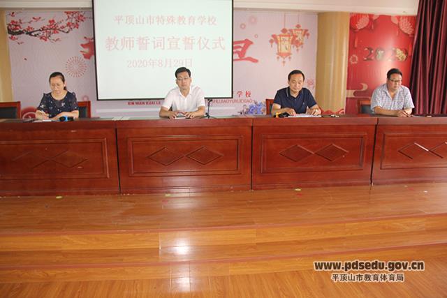 “我是一名光荣的人民教师,我庄严宣誓:忠诚党的教育事业,贯彻国家教育方针,恪守教师职业道德,履行教书育人职责……”8月29日上午,市特殊教育学校新学期“平顶山教师誓词”宣誓仪式在四楼会议室举行,学校领导及全体教职工参加了宣誓仪式。