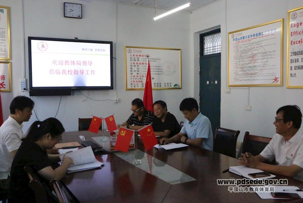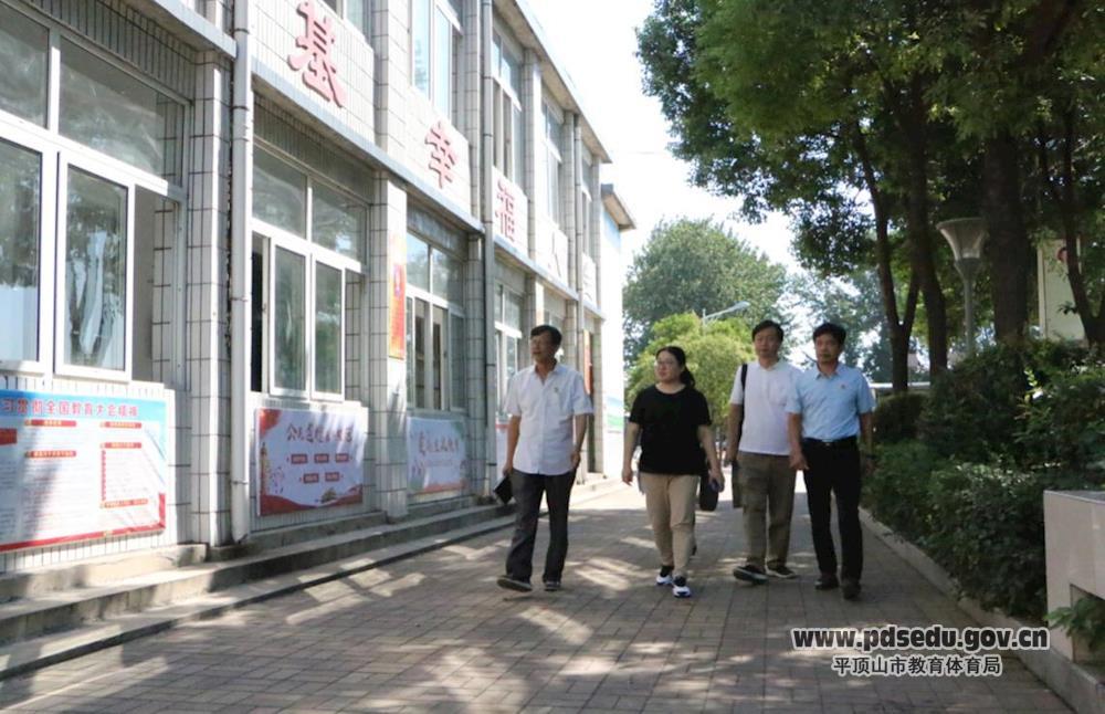 9月2日上午,平顶山市教育体育局教育督导科科长刘翌秋、市教育电视台台长李民一行两人,莅临市十五中检查秋季开学工作,十五中学校领导班子陪同检查。