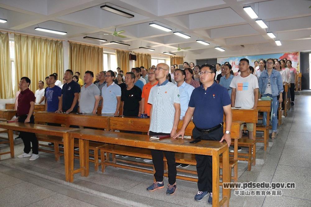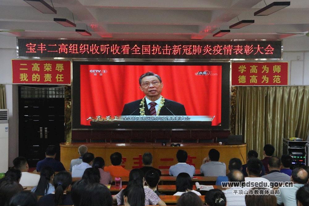 9月8日上午,宝丰县第二高级中学教师于学校师说厅集会,认真收看全国抗击新冠肺炎疫情表彰大会。