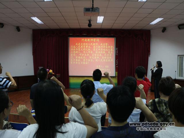 大会在雄壮的国歌声中拉开序幕,紧接着全体教师庄严肃立,高举右拳重温河南省教师誓词,阵阵发自肺腑的誓词,表明了全体教职工砥砺师德,承载使命,坚定信念、勇于担当的决心。