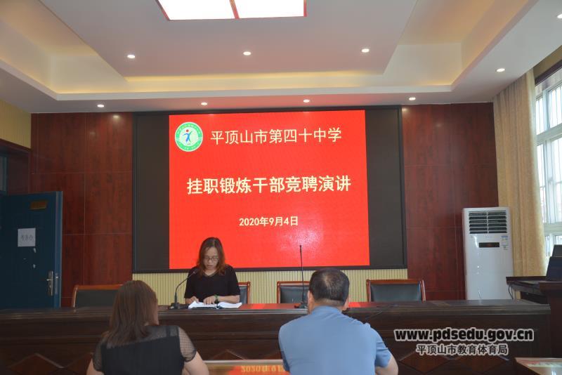 接到《中共平顶山市教育体育局党组关于推荐2020年局属事业单位挂职培养对象的通知》后,市四十中在学校报告厅开展挂职锻炼干部竞聘演讲会议。