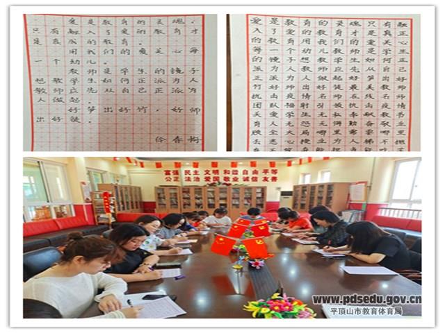 活动三:规范汉字,书写经典。保教处组织全体教师开展了教师规范汉字书写比赛,老师们积极参与、静心书写,横竖撇捺、一笔一画,认真书写,一幅幅隽秀的钢笔字作品彰显着老师们扎实的基本功。