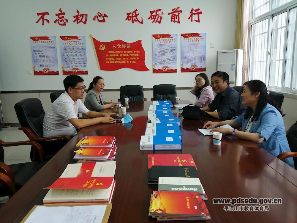 9月21日下午,平顶山市中小学校党建工作示范校考核组一行三人,在以市财经学校书记王敬献为组长的带领下,来到市特殊教育学校。市特殊教育学校支部书记、校长王绪顶及纪检委员、副校长侯凤娟和党建办公室工作人员参加了迎检工作。