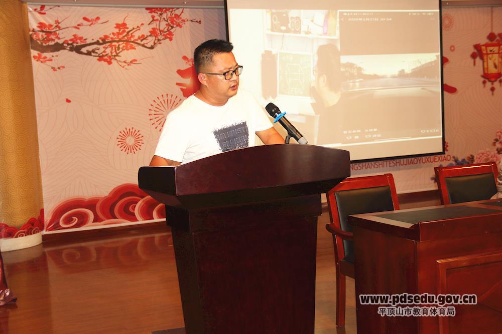 抗“疫”先进、校综治办主任潘理想用一幅幅幻灯片,把大家带回到那个惊心动魄的抗疫大战。潘理想于2020年元月25日接到抗击新冠肺炎疫情的指令后,立即从新城区的家里,赶到市南郊的学校,具体落实学校的各项紧急措施:强化门卫,严防外人进入;每天如实上报十几种报表;组织抗“疫”演练,切实织牢防护新型冠状病毒的篱笆。同时,还要进行线上教学。在五月份师生返校前后,潘理想更是用宽厚肩背上的一片片汗湿,与校领导、全体教师一起,坚定地守护着校园的安宁。而此时,正是潘理想的爱妻怀孕临产期间。他不顾家人劝说,多次冒着被感染的危险,奋力赶往校园抗疫,以校为家,确保校园平安的先进事迹,深深地触动着在场每一个人的心。