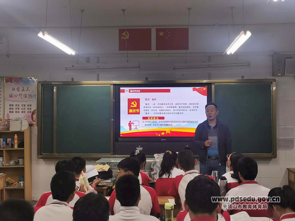 王刚辉等班主任制作了专门的PPT,详细向学生介绍了国庆节的来历、设定时间及意义,培养学生的爱国主义精神,激发学生为国家、为民族刻苦自励、积极向上的学习精神。