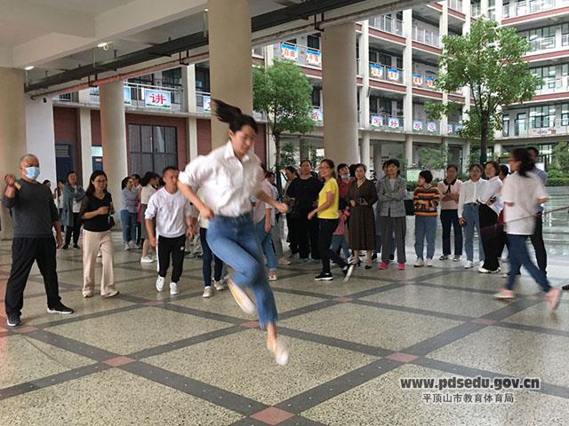 下午第二节课后,全体教职工迅速向学校前院汇集,分组展开热身训练。10分钟后,各组按抽签顺序开始比赛,参赛队员一个个身形矫健,翩若惊鸿,矫若游龙;摇大绳的两两配合默契,节奏一致,共同为集体荣誉而战。旁观的老师也热情高涨,有加油的、有拍照的、有录像的、有计数的……场上场下欢声雷动,气氛热烈。激烈的比赛很快结束了,最后行管组以145人次获得第一名,九年级组以114人屈居第二,八年级组和七年级组并列第三名。
