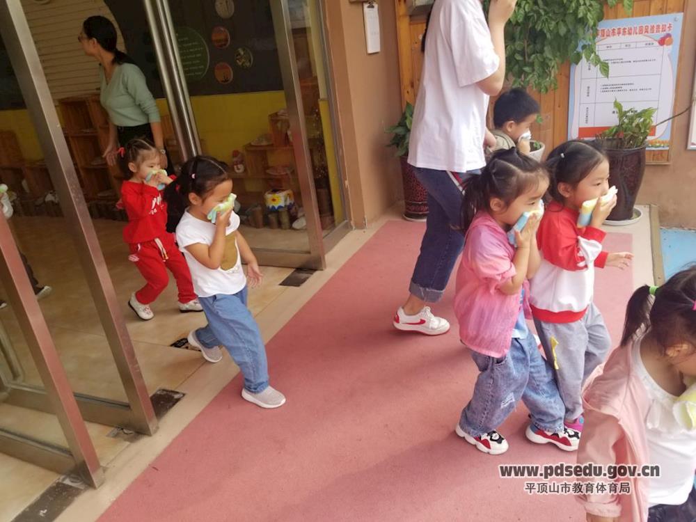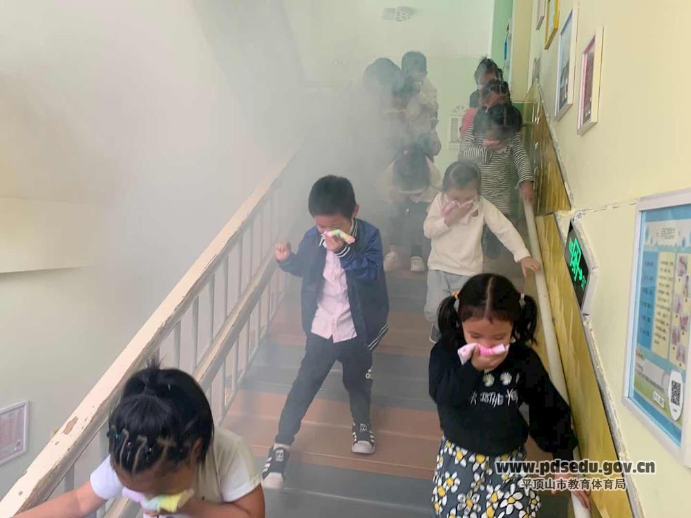 上午十点十分,随着警报声的响起,各班教师快速、有序地依据规定的疏散路线带领幼儿用湿毛巾捂住口鼻、弯下身体,冷静、有序地快步下楼疏散到了操场安全区域,整个演练用了3分钟45秒,活动紧张有序。