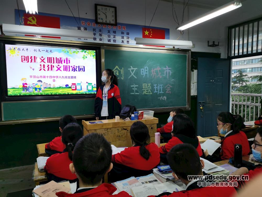 9月15日,十四中举行了“小手拉大手,创文一起走”活动启动仪式,向全体学生发放《致家长的一封信》,号召同学们和家长一起学习创文知识,熟记创文精神。各班还积极开展了创文知识宣传主题班会,班主任通过PPT、视频、歌曲等向学生介绍了创文重要性、“文明校园标准”、“十大不文明行为”等,引导学生做文明守礼好公民。