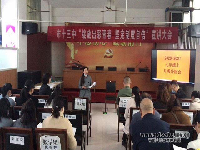 为贯彻落实教学常规,扎实提高学生学习效率,全面提高教育教学质量,10月20日下午,市十三中召开月考成绩分析会,校领导班子成员校长彭友林、副校长郭艺伟、校长助理李运魁等分别参加了各年级的会议。