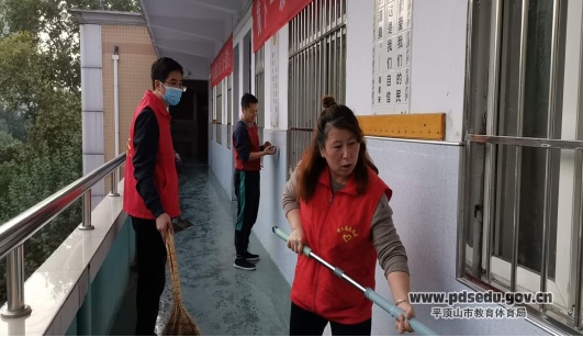 校领导带领教师们打扫教室走廊