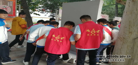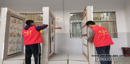 学生志愿者擦拭校园宣传栏