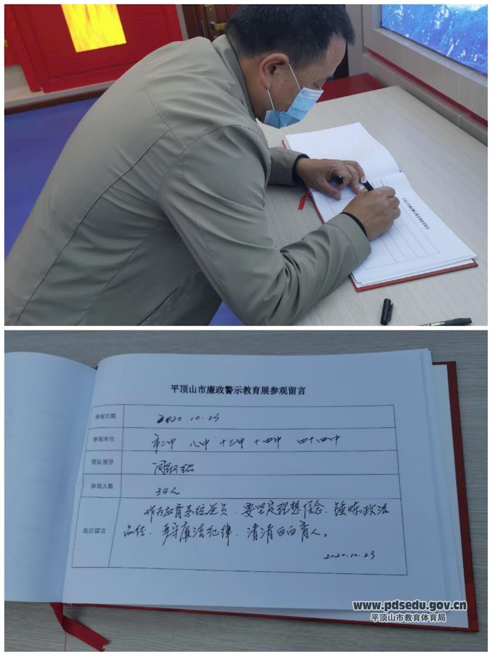 市二中校长闫纲绍在参观警示教育展后感慨万千,在留言本上写下了自己的感受:“作为教育系统党员,要坚定理想信念,锤炼政治品质,严守廉洁纪律,清清白白育人。”,字里行间无不显示着一个优秀党员领导干部的高风亮节。他再三强调,要牢固树立“四个意识”,坚定“四个自信”,时刻自警自省,防微杜渐,筑牢拒腐防变的思想道德之堤,让廉政警钟在耳边长鸣。