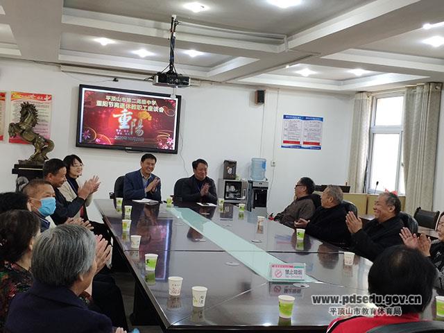 岁岁重阳,今又重阳。10月25日,在重阳节当天,市二高校长张建岭、副校长罗果、李宏照、校长助理郭家玺、工会主席汪培莉与部分离退休教师齐聚一堂,召开重阳节离退休教职工座谈会。现场掌声不断、气氛热烈。
