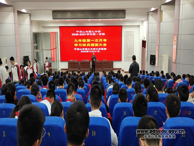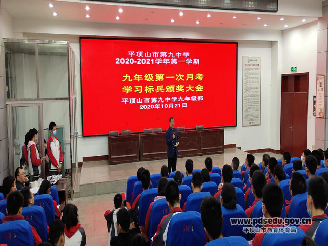 2020年10月21日下午,市九中九年级部在阶梯教室隆重召开了第一次月考学习标兵颁奖大会。市九中校长万邦浩、副校长宋新强、九年级年级主任郭鹏飞及九年级各班优秀学生参加了此次会议。