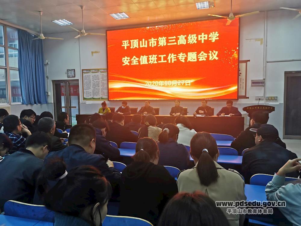10月27日,市三高召开安全行政值班专题会议,对进一步做好值班工作做出安排部署并提出具体要求。班子全体成员、中层以上干部以及全体值班人员参加会议。