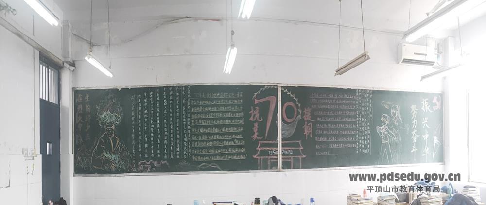 为了使学生们加深对抗美援朝战争的认识,并充分表达同学们的爱国之情。各班积极开展抗美援朝黑板报活动。无论是板报的精心绘画还是感人英雄故事的书写,无不从中感受到同学们对祖国的热爱以及对已逝英雄的敬佩。班级里也充满着抗美援朝精神的韵味,激励同学们学习先烈精神,为祖国建设添砖加瓦。