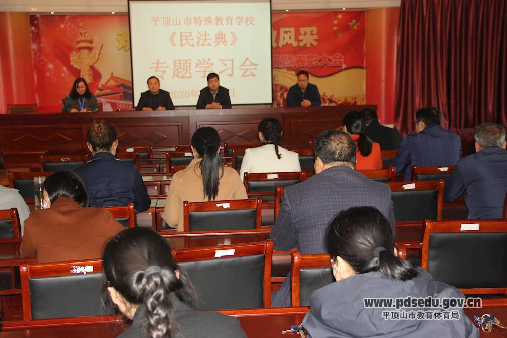 11月4日下午,市特殊教育学校在博雅楼大会议室召开了学习《民法典》专题会,副校长侯凤娟主讲。校党支部书记、校长王绪顶带领全体教师参加了专题会。