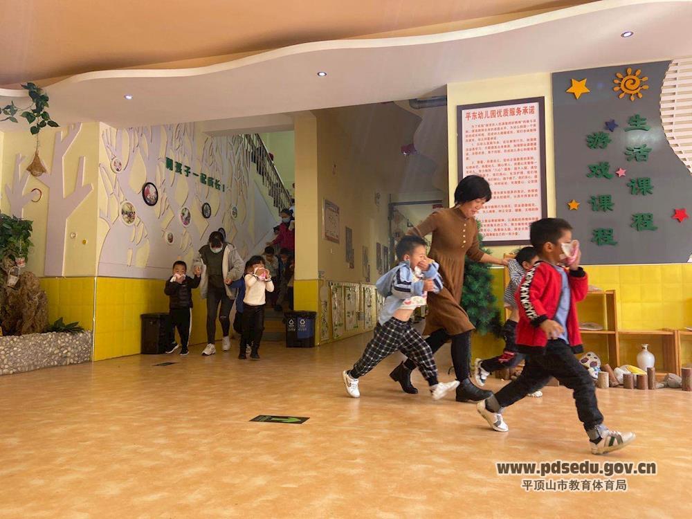 下午2:30,在一阵急促的警报声中,演练正式开始。在平东幼儿园园长的带领和指挥下,各班老师快速地组织幼儿从各安全通道紧急疏散,三位老师一前一中一后,保障孩子们疏散途中的安全!各班幼儿在老师沉着、有序的组织下用湿毛巾捂着口鼻、弯着身子,按指定的路线紧张有序地逃离了“火灾现场”,到达安全场地集合,并及时清点幼儿人数,整个撤离演练2分25秒,做到了快速、安全、有序。