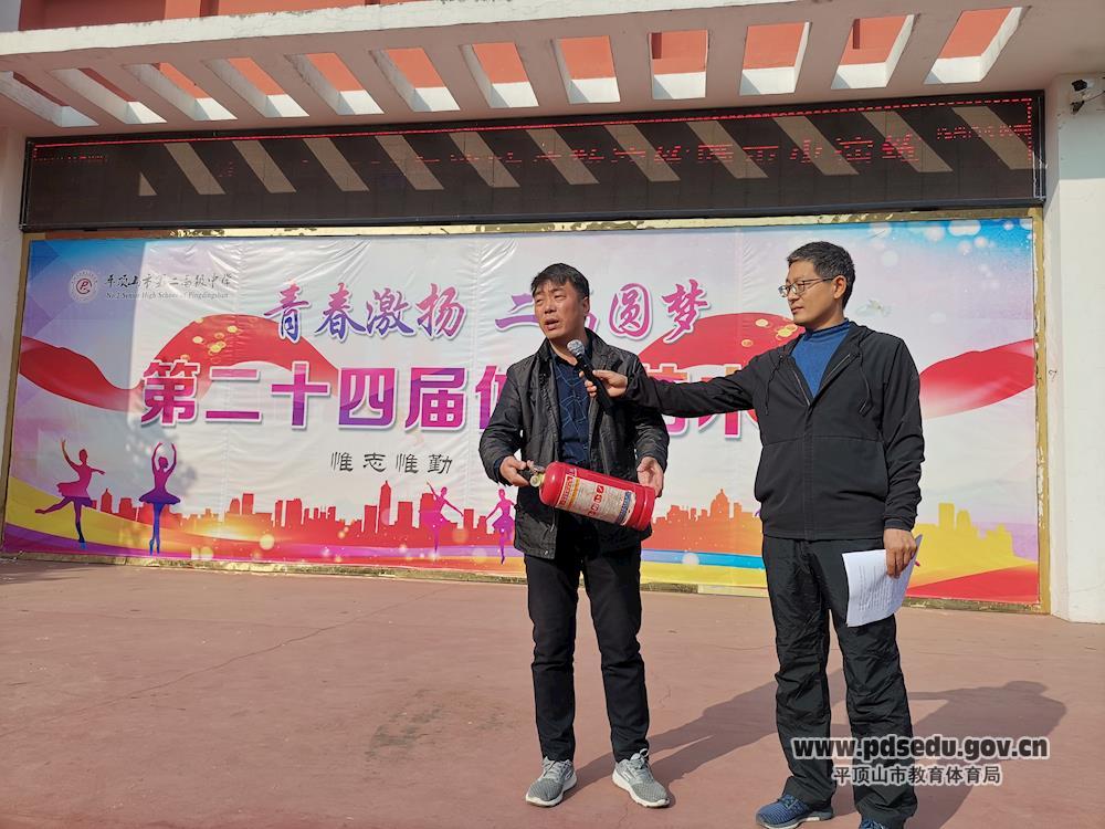 最后,本次消防演练领导小组组长、市二高校长张建岭对此次消防演练进行总结。指出本次疏散演练比平时课间操集合速度快了一分钟,基本达到了本次演练的目标,但离学校对大家的最终要求还有一定差距,希望全体师生通过本次演练熟练掌握逃生技能,学会正确使用灭火器处理早期火灾,争取在以后的演练中进一步缩短逃生时间,达到在突发灾难时全体师生安全撤离的要求。