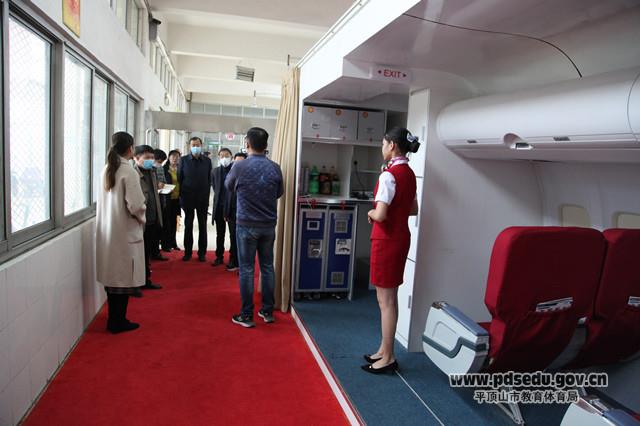 此外,调研组还察看了学校航空服务和城市轨道管理与服务两个专业的实训室——航空模拟仓,现场听取了马庆业对这两个专业毕业生就业情况的介绍。