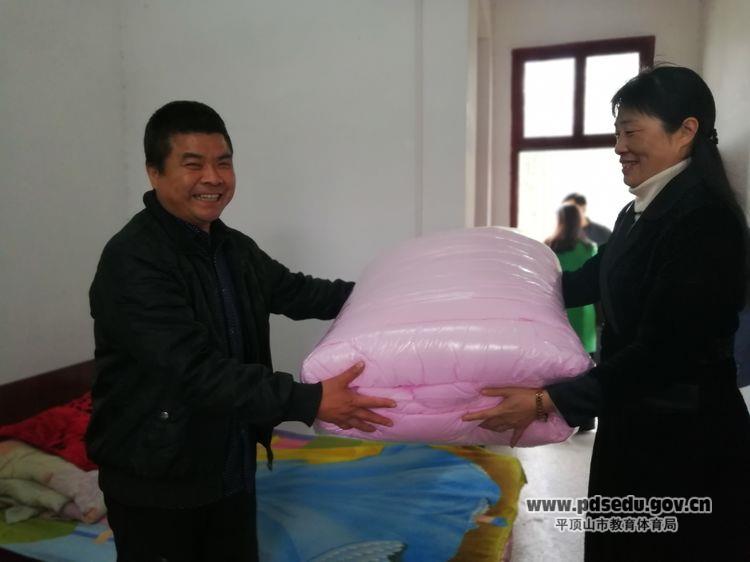 范娜妹、苏豪珍与支教教师深谈了许久,还实地查看了两位老师的宿舍,分别从工作上和生活上给予关心,亲切的询问此次支教在工作上是否顺手?生活上是否还习惯?并为支教教师送去冬被和水果。