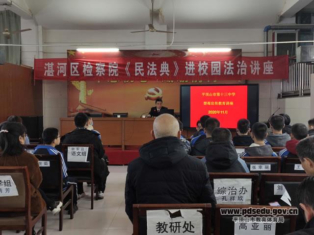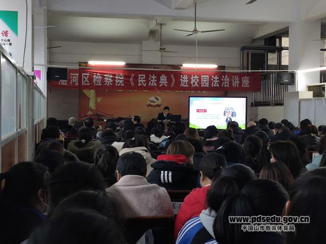 为贯彻落实《民法典》的有关精神,增强全体学生及教职工的法律意识,市十三中于11月26日下午,特邀湛河区人民检察院一行来该校进行以“民法典进校园”为主题的专题讲座。