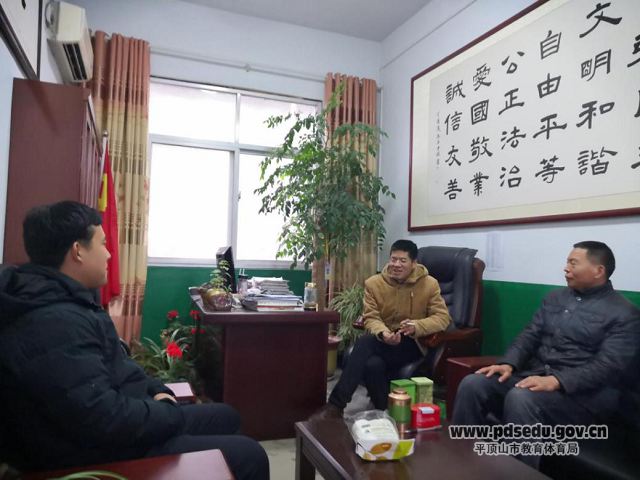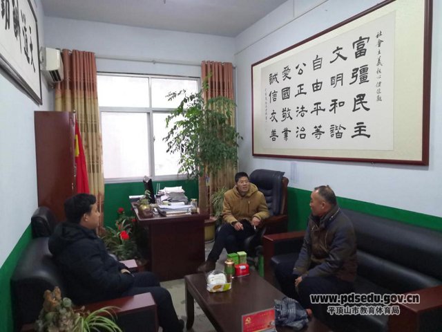 胡春明等一行三人首先来到鲁山库区中学,鲁山库区中学校领导就学校基本情况进行了介绍,非常感谢市九中送来张学喜这样优秀的支教老师。张学喜担任化学课教学,适应能力强、角色转换快,为鲁山库区中学教育注入了新的活力,是孩子们真心喜爱的好老师。
