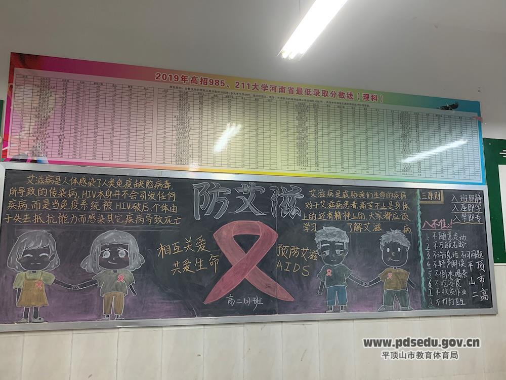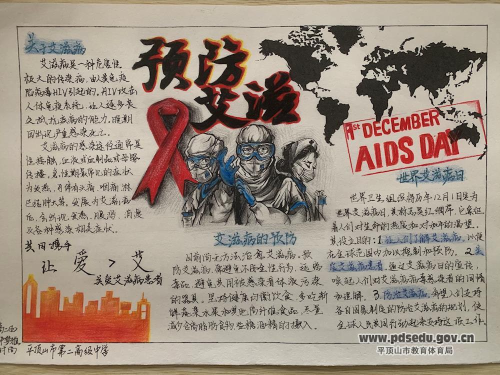 2020年12月1日是第33个“世界艾滋病日”,青年学生既是受艾威胁的重点人群,也是预防艾滋病的主力军。为引导学生了解艾滋病的严重危害,倡导文明健康行为,践行健康生活方式。自11月23日以来,市二高开展了以“携手防疫抗艾,共担健康责任”为主题的“世界艾滋病日”宣传教育系列活动。