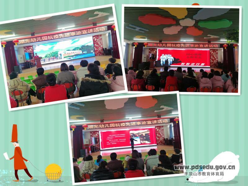 为深刻领会习近平总书记重要讲话精神的重大意义,大力弘扬伟大抗疫精神,广泛宣传在抗疫斗争中涌现出的先进人物和典型事迹,彰显先进典型勇于担当、敢于拼搏的责任使命。市湖光幼儿园组织全体教职工认真学习了习近平总书记在全国抗击新冠肺炎疫情表彰大会上的重要讲话精神的文件通知,并于12月3日下午,在多功能厅举行了抗疫先进事迹宣讲活动。