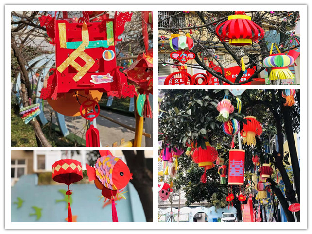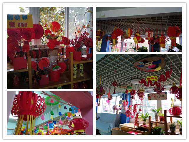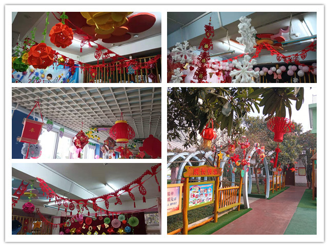 环境创设前,教师引导孩子们进行了热烈的讨论,制定了各自班级的布置方案,孩子们兴致勃勃地做彩环、纸花、窗花、灯笼等来装点教室环境。为弘扬和传播中华民族优秀传统文化,培养孩子的动手能力,增进亲子间的感情,各班老师鼓励孩子在家和父母一起动手,进行亲子手工制作活动。活动中,孩子和家长集思广益、分工合作,废旧利用,精心制作出一件件精美的挂件和装饰品,用一双双巧手把幼儿园装点得亮丽多彩,教室里张灯结彩,走廊里喜气洋洋,连大树也“换”上了新装,充满了浓浓的节日气氛。