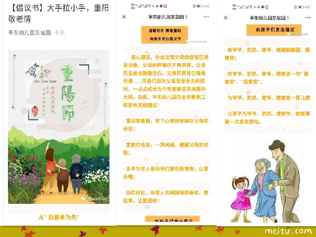 接着,幼儿园通过微信公众号和各班级家长群向家长们发起平东幼儿园“大手牵小手,重阳敬老情”活动倡议书。倡导家长和孩子一起为家中的老人送上三个”一”,一起陪老人吃一顿饭、一起对老人说一句祝福的话语、一起为老人做一件事情。