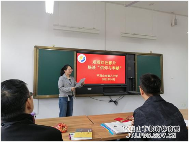 10月14日,市八中以教研组为单位,举行“观看红色影片,畅谈‘信仰与奉献’”师德师风建设活动。