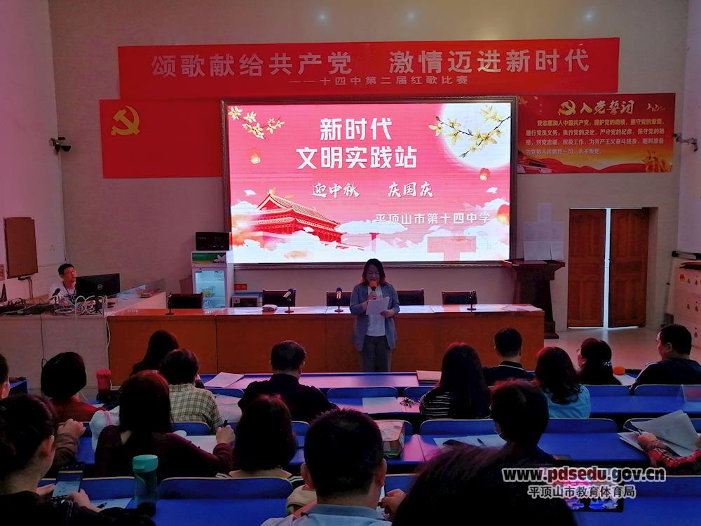 为推动习近平新时代中国特色社会主义思想更加深入人心,进一步深化精神文明建设,市十四中结合实际,因地制宜,于9月28日下午在阶梯教室开展了“迎中秋,庆国庆”新时代文明实践站活动,领导班子成员和全体教职工参加了活动。