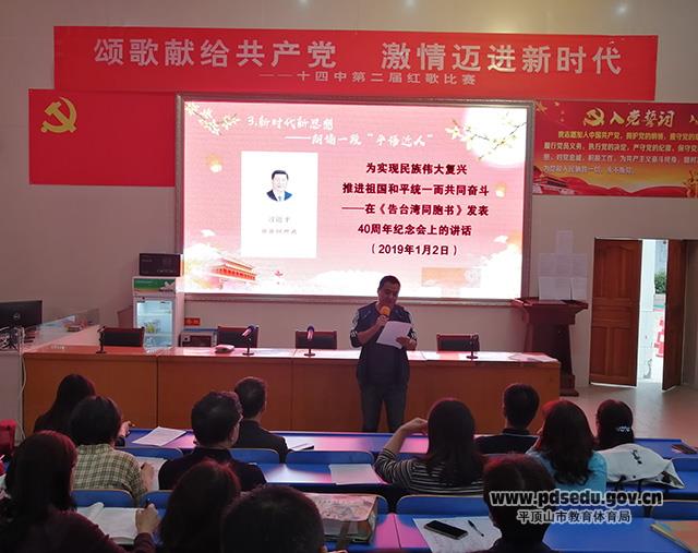 活动中,十四中全体教职工了解了作为中国四大传统节日之一的中秋节的由来,在李贝和王亚慧两位老师的带领下,合唱了歌曲《我和我的祖国》。杜玉峰、宋瑞和杨晓辉三位老师诵读了习近平总书记《为实现民族伟大复兴 推进祖国和平统一而共同奋斗》——在《告台湾同胞书》发表40周年纪念会上的讲话。纪然老师讲述了人民英雄张定宇的英雄事迹。陈蓓、马莹莹、侯晓静三位老师分别分享了自己的实践感悟。