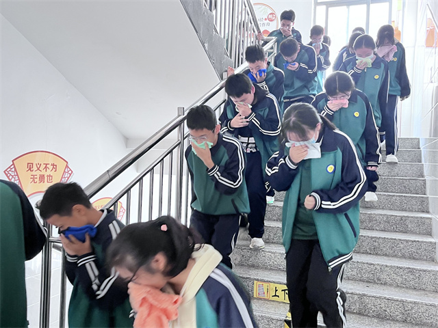 9月24日上午9时40分演练开始,警报响起后,各班级迅速响应——班主任组织学生用湿毛巾捂口鼻、弯腰低姿,沿预定路线快速撤离;履行安全引导员职责的教师在楼梯口、拐角处引导,避免拥挤;全校师生均有序抵达操场,撤离率100%,无意外情况发生。