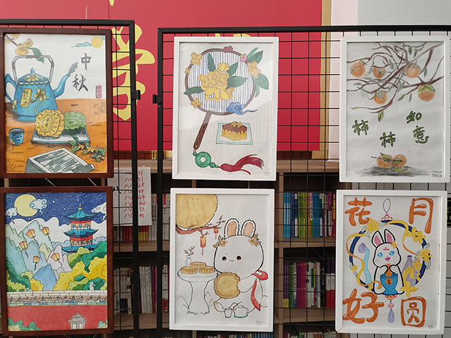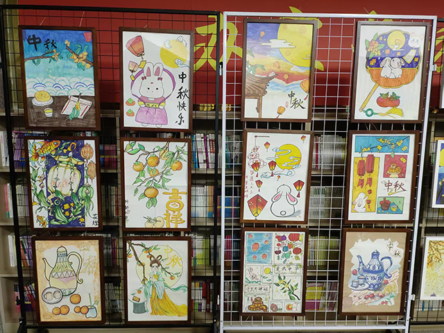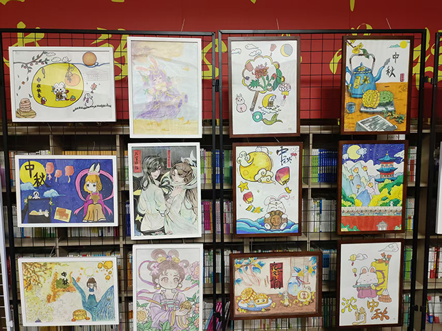 展览的作品形式丰富多元,彩铅、马克笔、水彩等创作手法各展风采。彩铅画下,月饼的酥软纹路、玉兔的灵动姿态被细腻笔触一一勾勒,每一处细节都藏着学子对中秋的巧思;马克笔作品则以明快饱和的色彩,定格圆月与庭院、花灯相映的温馨画面,笔触间满是青春朝气;水彩画更显雅致,通透的颜料晕染出赏月的团圆夜景,朦胧意境里满是节日的温柔。从嫦娥奔月的神话场景,到灯笼、桂花、团扇等经典中秋元素,每一幅作品都是学子们对“团圆”的独特诠释,笔墨间满是少年对传统节日的热爱。